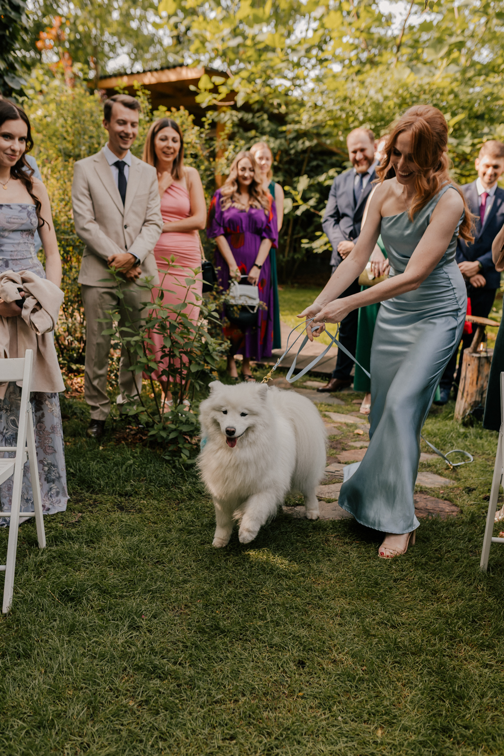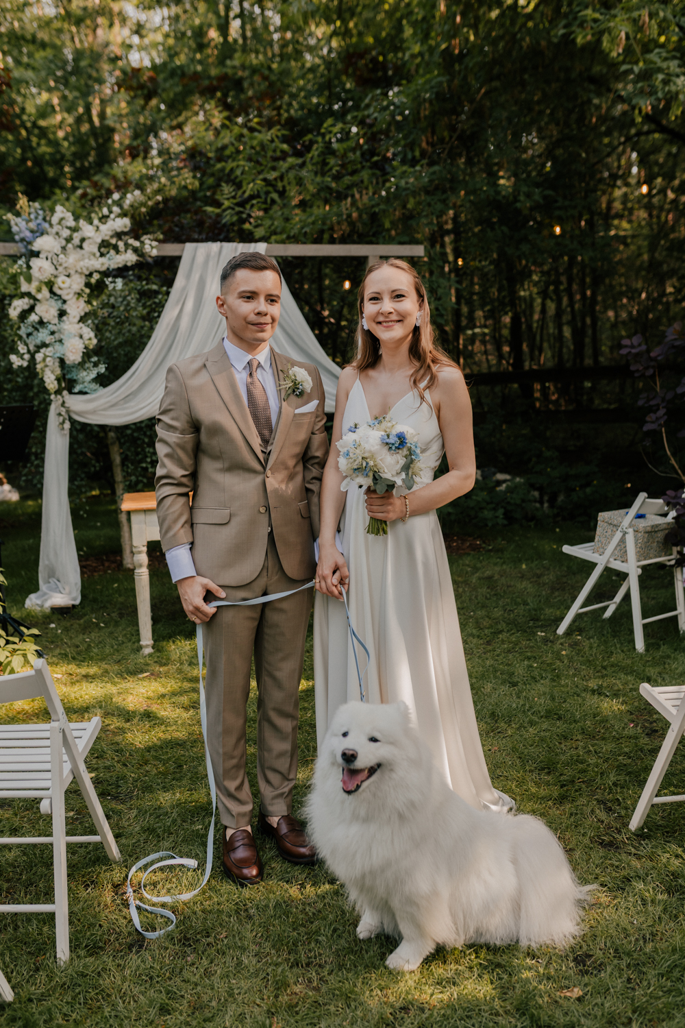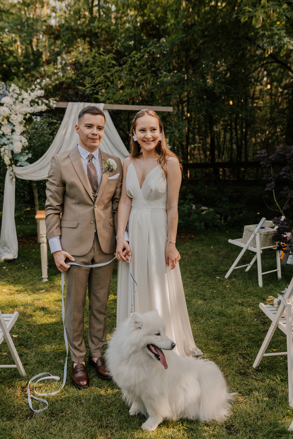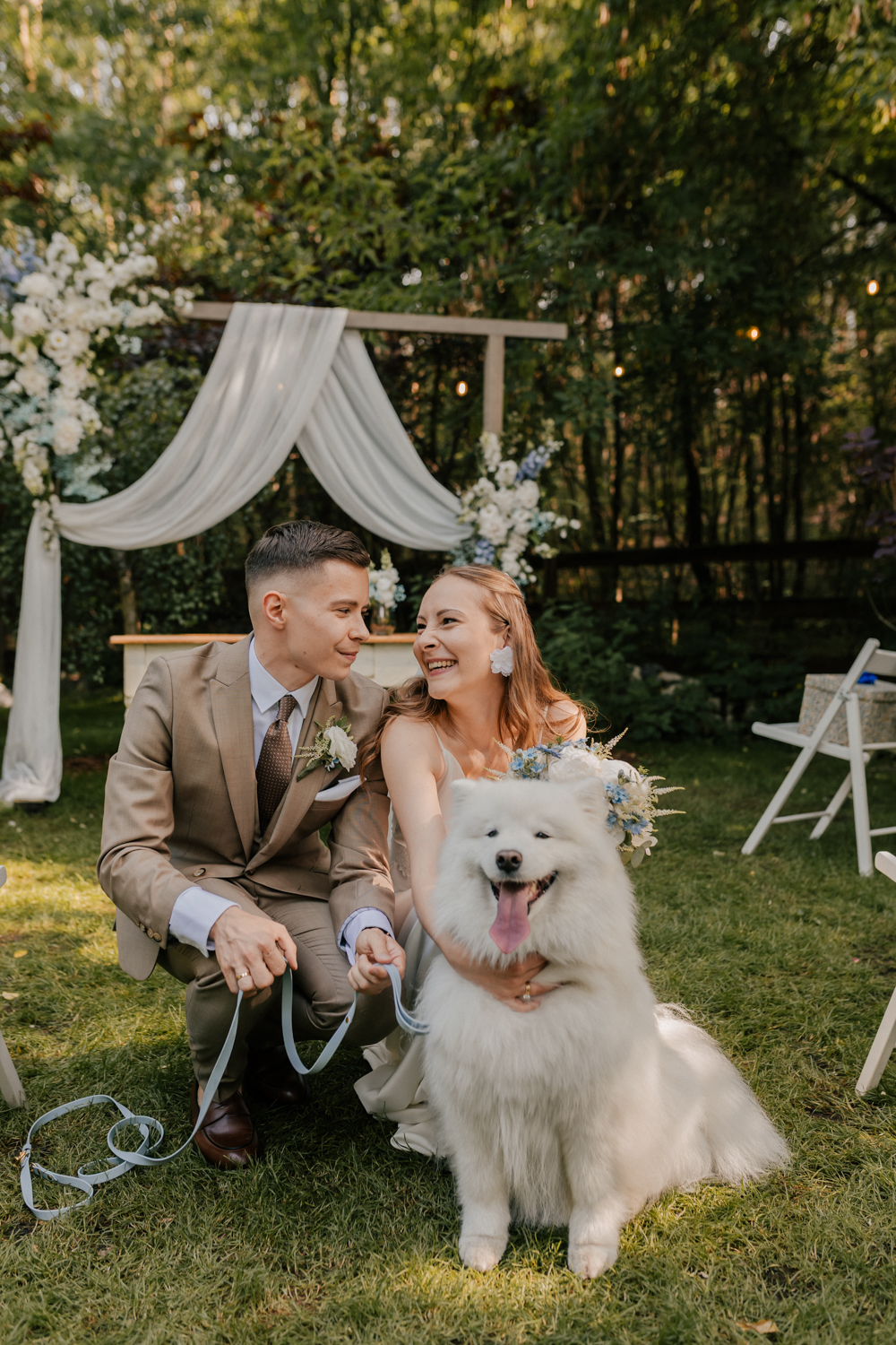 Przed Wami zdjęcia ze ślubu plenerowego z psem, w przypadku Moniki i Kamila – z Ich sunią – Samojedką, Elzą w totalnie pięknej przestrzeni, jaką jest Kimura Glamping. To był początek czerwca, pogoda wciąż niepewna, ale w najważniejszych momentach dnia udawało się być pod chmurką bez deszczu 🙂