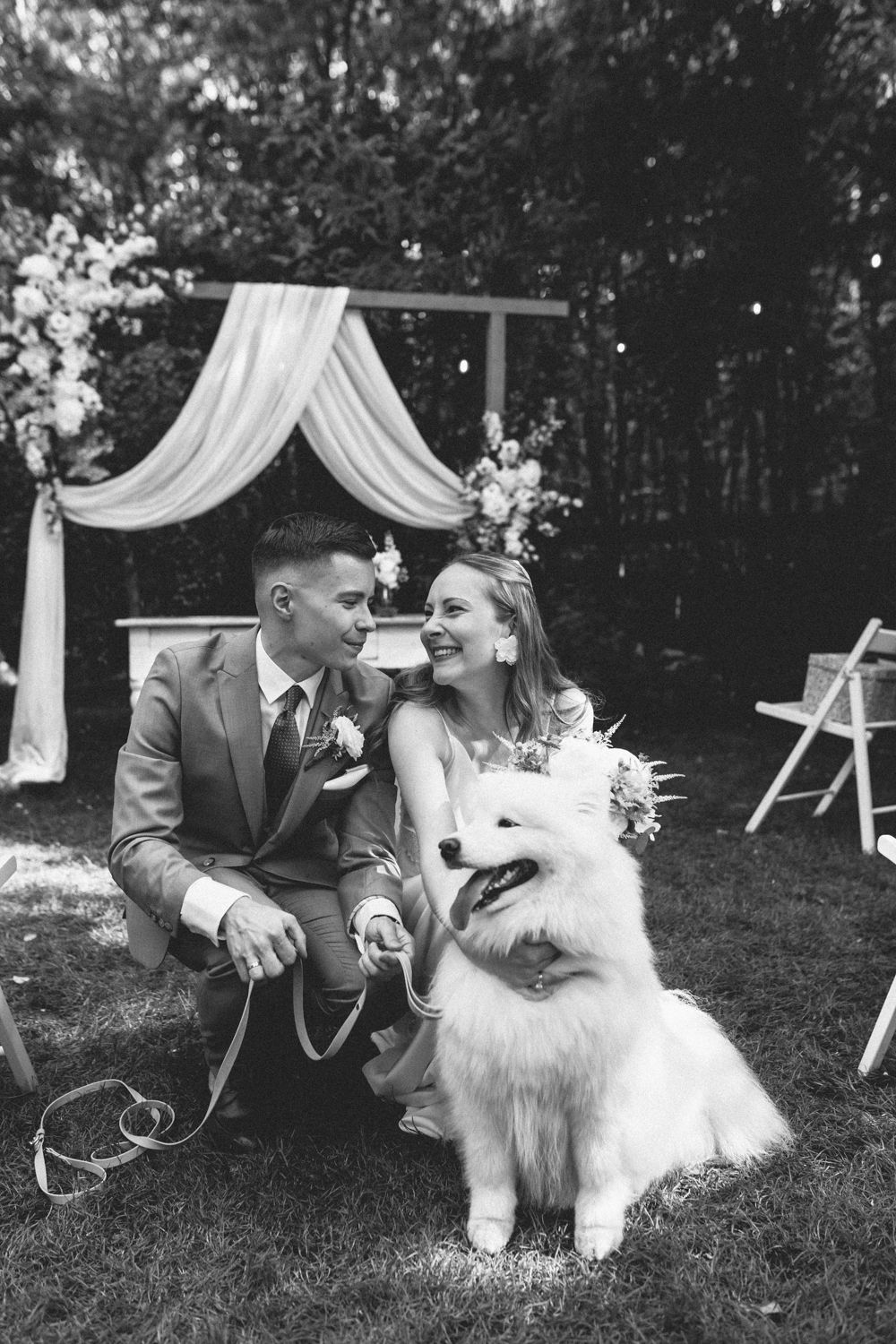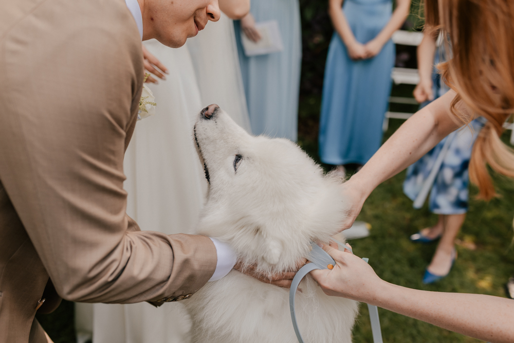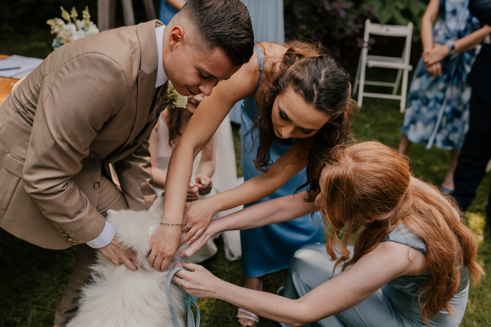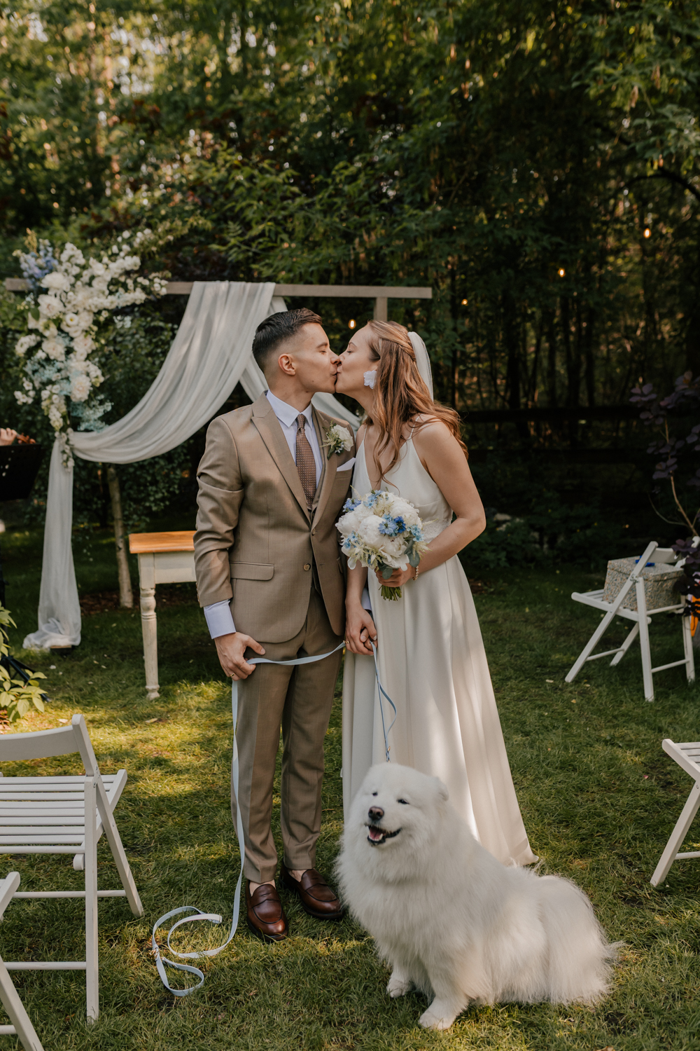 Przed Wami zdjęcia ze ślubu plenerowego z psem, w przypadku Moniki i Kamila – z Ich sunią – Samojedką, Elzą w totalnie pięknej przestrzeni, jaką jest Kimura Glamping. To był początek czerwca, pogoda wciąż niepewna, ale w najważniejszych momentach dnia udawało się być pod chmurką bez deszczu 🙂