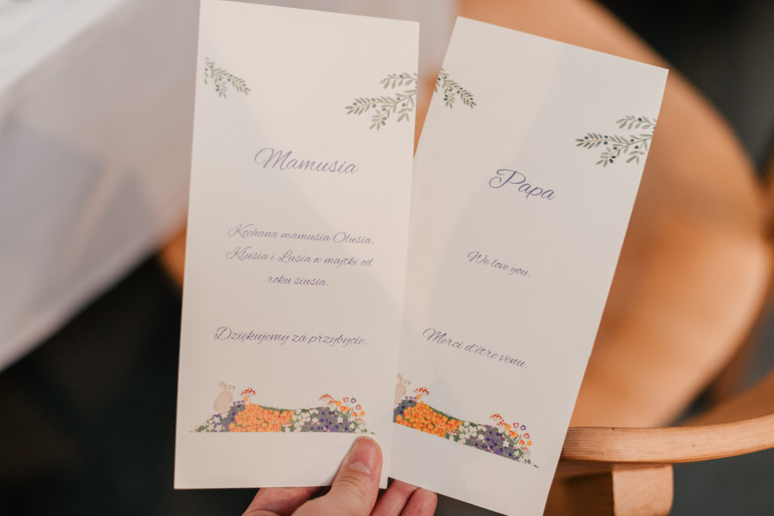 Będąc już w temacie uroczystego przyjęcia z tej okazji – muszę przyznać, że chyba po raz pierwszy spotkałam się z podziękowaniem dl Gości z okazji Chrztu i tak przepięknymi winietkami. Pprzy każdym talerzyku, obok danej osoby, było kilka zdań w imieniu dziewczynek, spersonalizowane i bardzo wzruszające! Za co są wdzięczne, albo z czym kojarzą im się ciocie, wujkowe, kuzynostwo, itp. Teksty w zależności oczywiście od narodowości były w języku polskim lub francuskim.